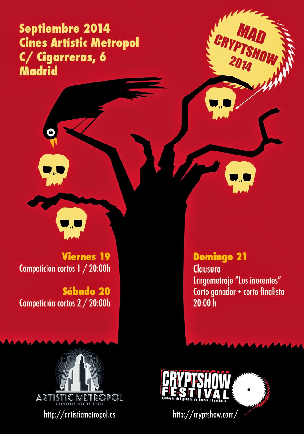 El Cryptshow Festival (Badalona) extiende sus tentáculos más allá de su ciudad natal y vuelve a atemorizar Madrid, celebrando la segunda edición de MADCryptshow los próximos 19, 20 y 21 de septiembre en el Artístic Metropol de Madrid. De esta manera el festival catalán quiere consolidar esta delegación madrileña desde donde promocionar lo mejor del cortometraje de terror y fantástico internacional.